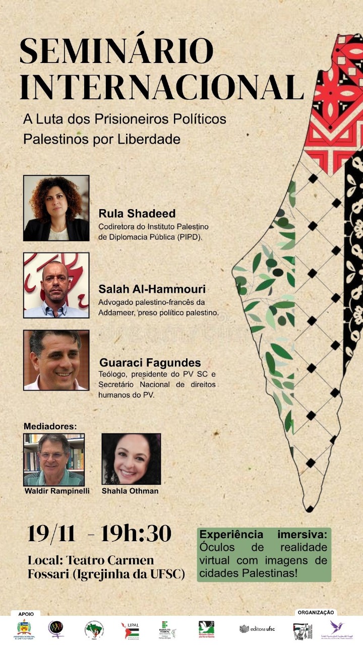O Comitê Catarinense de Solidariedade ao Povo Palestino Khader, em parceria com o Instituto Palestino de Diplomacia Pública (PIPD), convida para o seminário internacional: